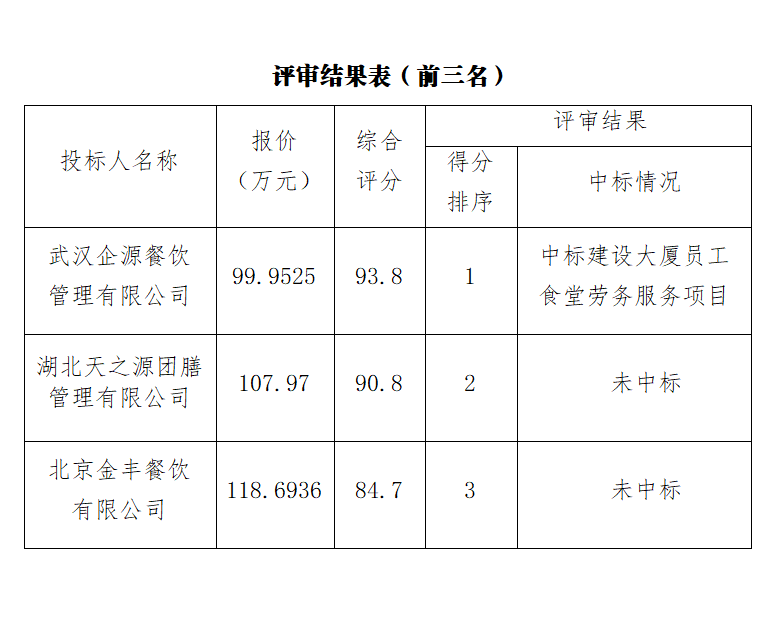 ? ? 經(jīng)評審,綜合評分排名第一為武漢企源餐飲管理有限公司,報價為99.9525萬元/年,綜合評分為93.8分,中標武漢市政工程設(shè)計研究院有限責(zé)任公司建設(shè)大廈員工食堂勞務(wù)服務(wù)項目。