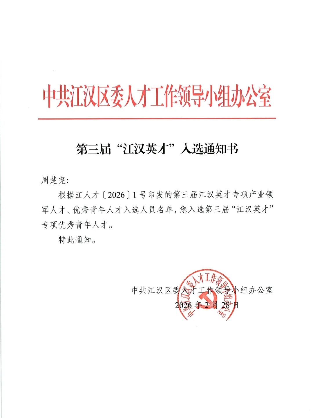 周楚堯同志榮獲江漢英才優(yōu)秀青年人才稱號