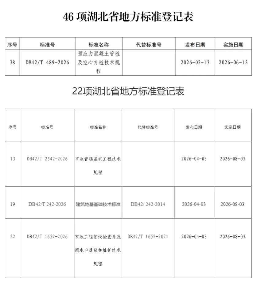 近日,由湖北省市場監(jiān)督管理局正式批準(zhǔn),公司主編的《市政管涵基坑工程技術(shù)規(guī)程》(DB42/T 2542-2026)、《市政工程管線檢查井及雨水口建設(shè)和維護(hù)技術(shù)規(guī)程》(DB42/T 1652-2026),以及參編的《建筑地基基礎(chǔ)技術(shù)標(biāo)準(zhǔn)》(DB42/T 242-2026)、《預(yù)應(yīng)力混凝土管樁及空心方樁技術(shù)規(guī)程》(DB42/T 489-2026)正式發(fā)布,為湖北省及武漢市工程建設(shè)提供權(quán)威、科學(xué)、先進(jìn)的技術(shù)指導(dǎo)。