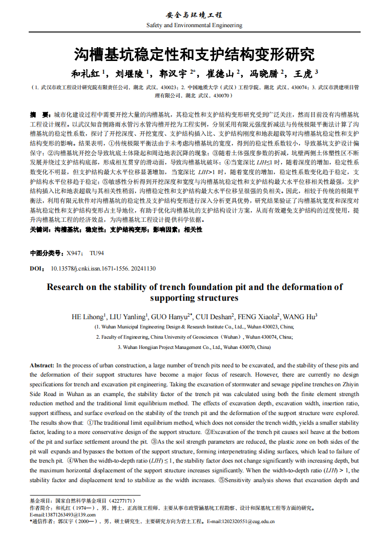 《市政管涵基坑穩(wěn)定性和支護(hù)結(jié)構(gòu)變形研究》被中文核心期刊《安全與環(huán)境工程》正式錄用。論文圍繞市政管涵基坑工程的核心安全問題,通過大量工程實(shí)踐與理論分析,為基坑穩(wěn)定性評價(jià)與變形控制提供了堅(jiān)實(shí)的理論支撐與計(jì)算方法。