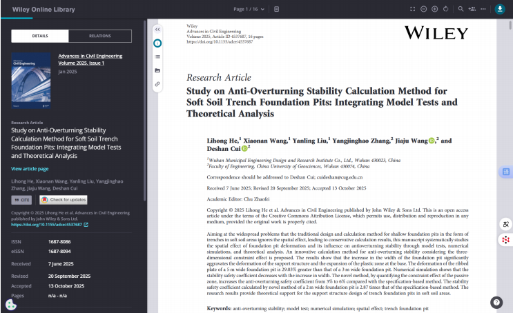 《Study on Anti-Overturning Stability Calculation Method for Soft Soil Trench Foundation Pits: Integrating Model Tests and Theoretical Analysis》成功被 Wiley Online Library 旗下國際權(quán)威期刊 Advances in Civil Engineering 收錄。論文針對軟土地區(qū)市政管涵基坑抗傾覆穩(wěn)定性難題,創(chuàng)新性地融合了室內(nèi)模型試驗(yàn)分析與典型工程實(shí)踐經(jīng)驗(yàn),提出了更精準(zhǔn)的計(jì)算方法,研究成果已被 SCI 檢索,標(biāo)志著公司在巖土領(lǐng)域的技術(shù)研究水平達(dá)到國際前沿。