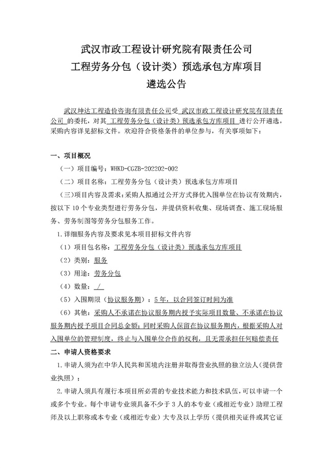 武漢市政工程設計研究院有限責任公司工程勞務分包(設計類)預選承包方庫項目遴選公告